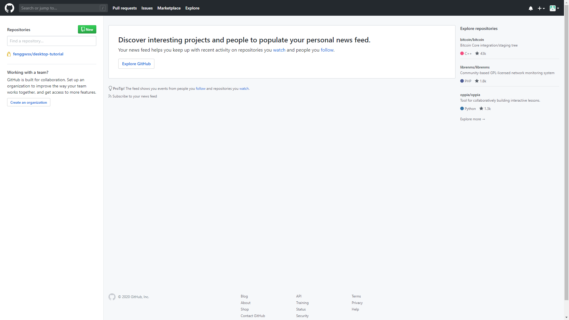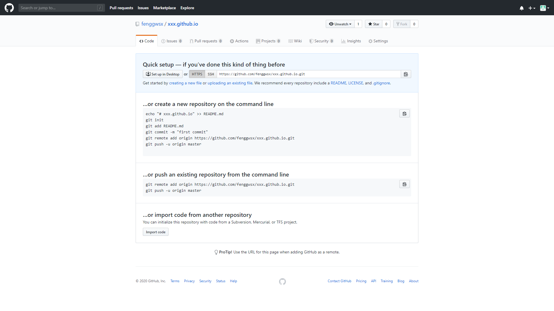 完成创建后,页面会自动跳转到刚刚建立的新仓库,此时个人主页还不可以被打开