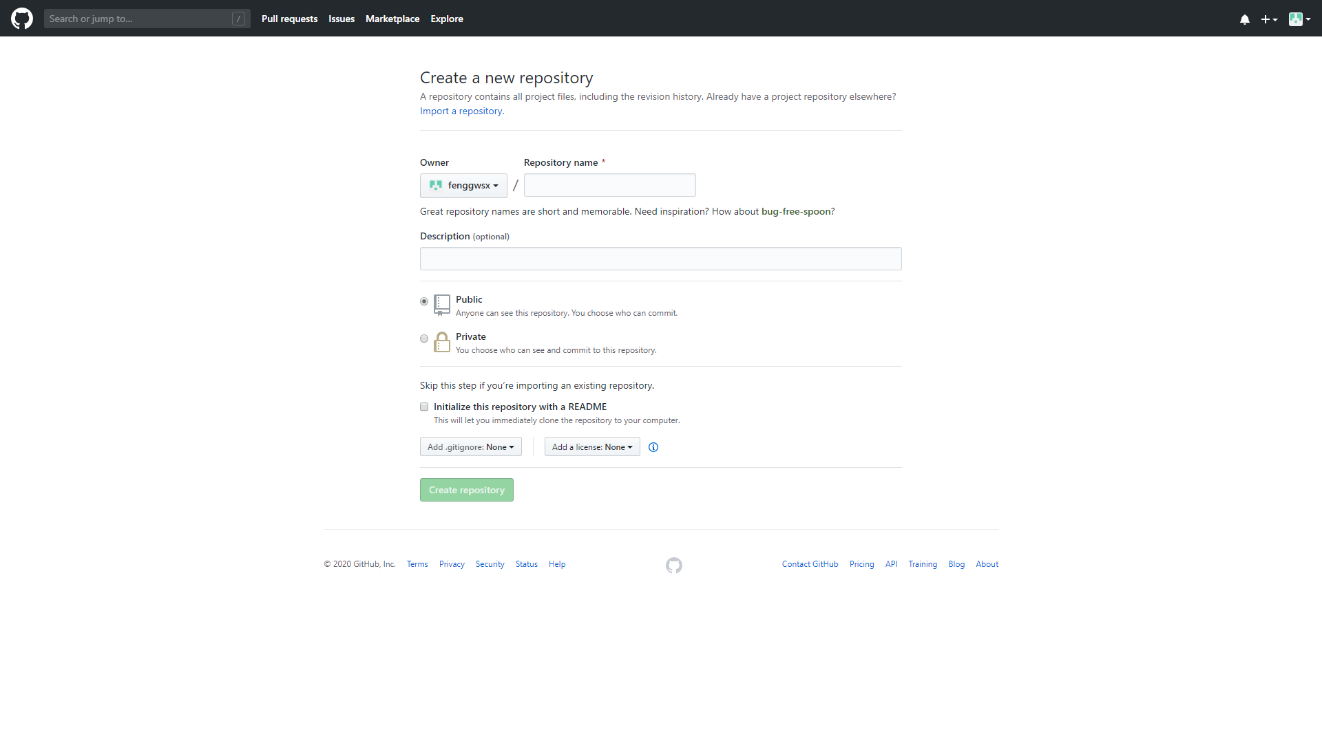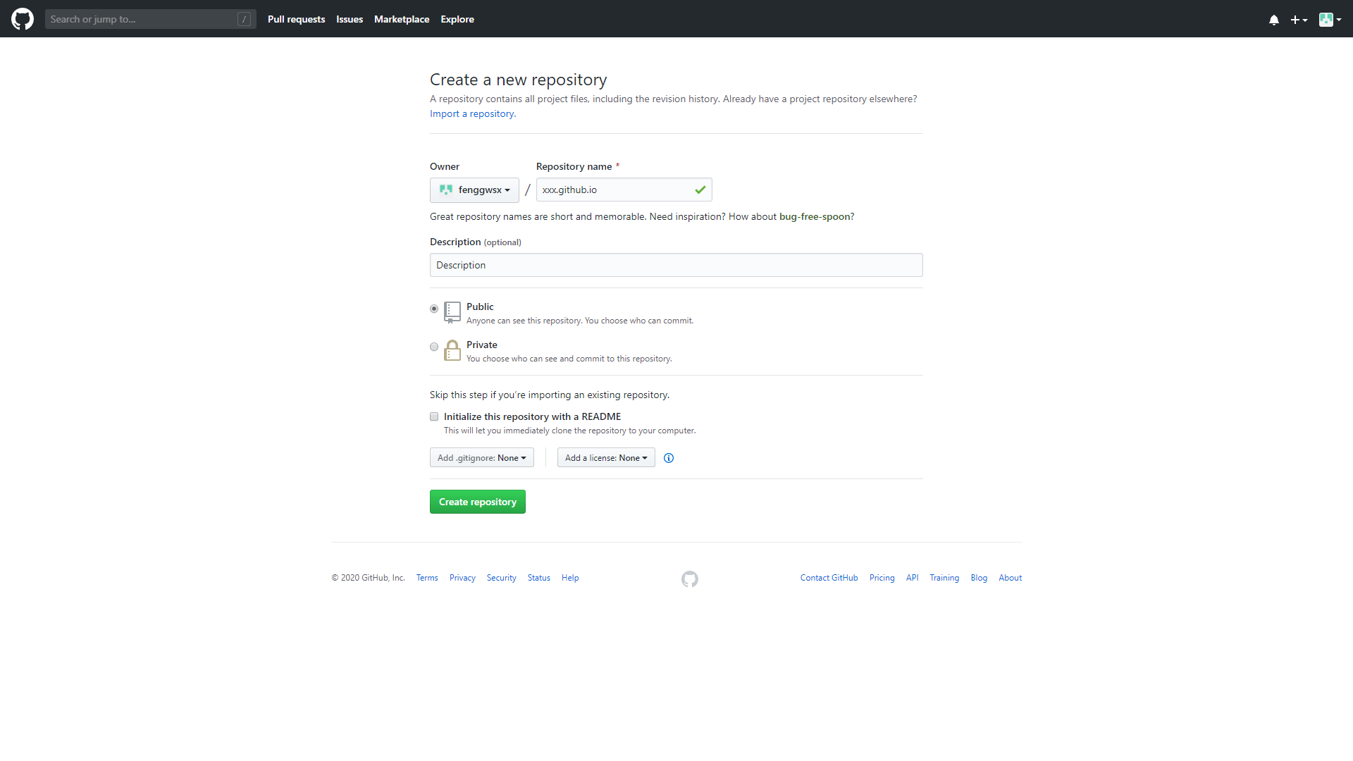 输入Repository name和Description,由于要建立的是个人主页,Repository name的格式要符合"xxx.github.io",Description可以对个人主页进行描述,可以不填写,完成信息填写后,点击Create repository