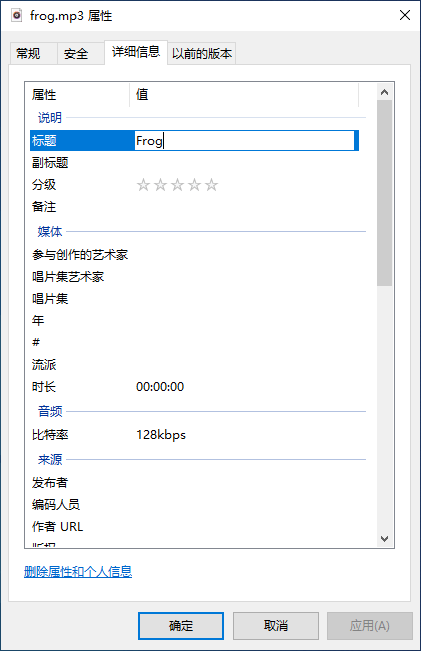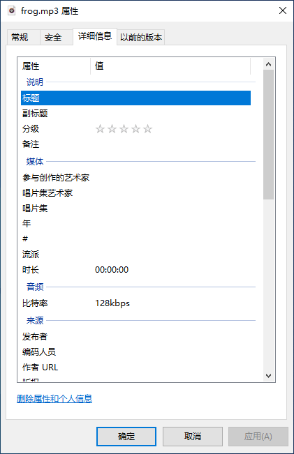 值得注意的是,在手机中显示的音效名称不是音频文件的文件名,而是音频文件的标题,所以我们要打开音频文件的属性,在详细信息栏目中,点击“删除属性和个人信息”: