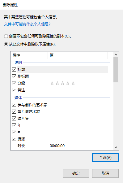 选择“从此文件中删除以下属性”,点击“全选”后确定: