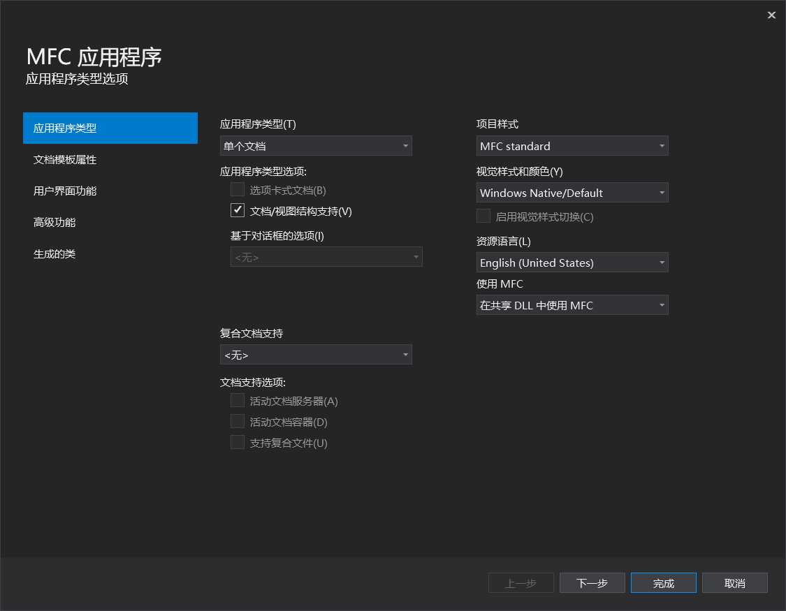 为了方便演示,我在创建MFC项目时,选择的应用程序类型为单文档,项目样式为MFC standard: