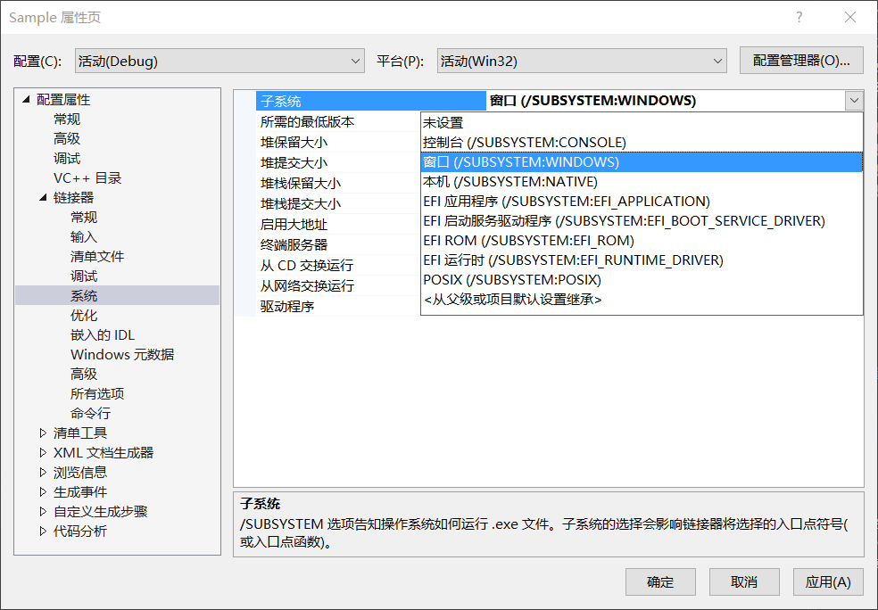 在链接器中系统选项下的子系统设置为”窗口“