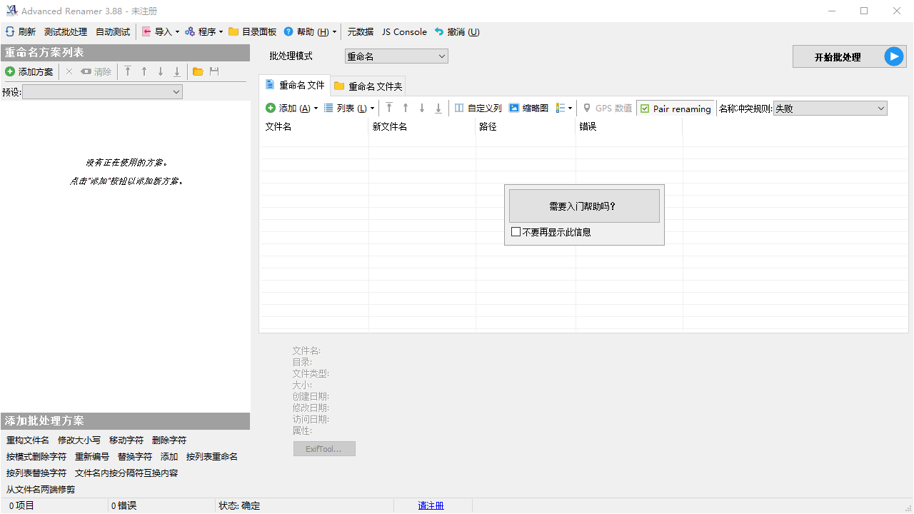 这是一个批量更改文件或文件夹名称的软件,无需进行注册购买就能使用绝大部分功能,可以对文件名称按照预定方案批量修改、自动编号等,但是只有注册的用户才能使用正则表达式