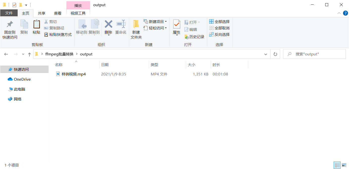 将要转换的视频放入文件夹中,双击运行批量转换.bat,如果文件较大,转换会比较耗时,转换完成后会生成output文件夹,打开output文件夹就能看到转换成功的视频: