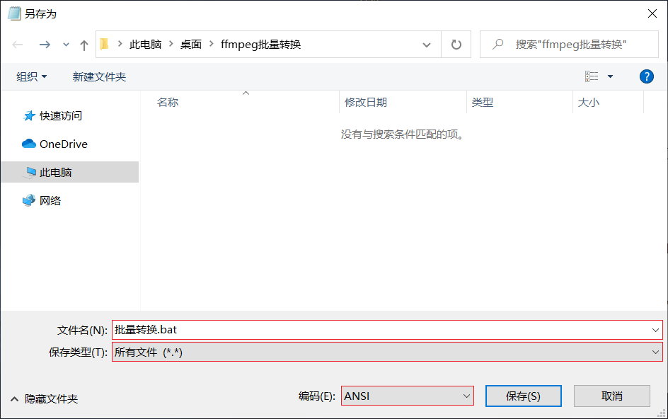 接下来进行保存,先选择文件类型为“所有文件”,然后输入文件名为“批量转换.bat”,最后设置编码为ANSI: